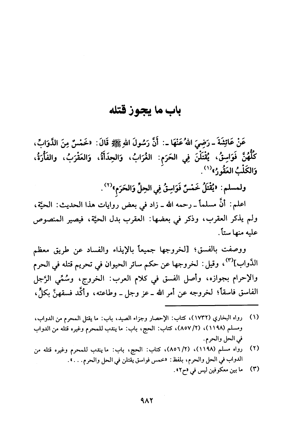 (¬2) رواه مسلم (1198)، (2/ 856)، كتاب: الحج، باب: ما يندب للمحرم وغيره قتله من الدواب في الحل والحرم، بلفظ: "خمس فواسق يقتلن في الحل والحرم ... ".