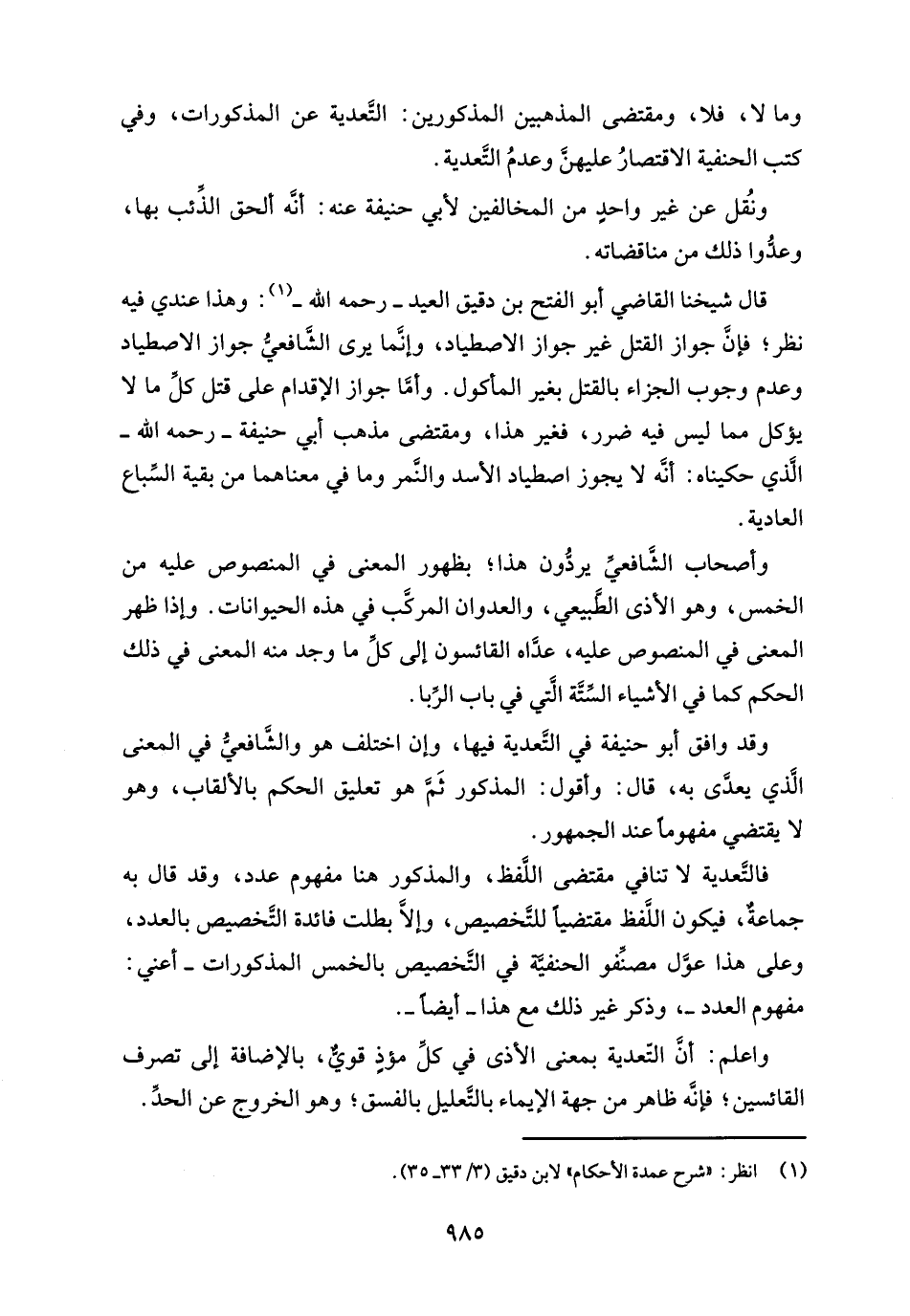 وأصحاب الشَّافعيِّ يردُّون هذا؛ بظهور المعنى في المنصوص عليه من الخمس، وهو الأذى الطَّبيعي، والعدوان المركَّب في هذه الحيوانات. وإذا ظهر المعنى في المنصوص عليه، عدَّاه القائسون إلى كلِّ ما وجد منه المعنى في ذلك الحكم كما في الأشياء السِّتَّة الَّتي في باب الرِّبا.