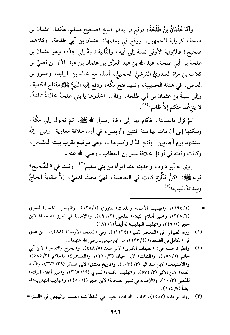 وأمَّا عُثْمَانُ بنُ طَلْحَةَ، فوقع في بعض نسخ "صحيح مسلم" هكذا: عثمان بن طلحة، كرواية الجمهور، ووقع في بعضها: عثمان بن أبي طلحة، وكلاهما صحيح؛ فالرِّواية الأولى نسبة إلى أبيه، والثَّانية نسبةً إلى جدِّه، وهو عثمان بن طلحة بن أبي طلحة، عبد الله بن عبد العزَّى بن عثمان بن عبد الدَّار بن قصيِّ بن كلاب بن مرَّة العبدريُّ القرشيُّ الحجبيُّ، أسلم مع خالد بن الوليد، وعمرو بن العاص، في هدنة الحديبية، وشهد فتح مكَّة، ودفع إليه النَّبيُّ - صلى الله عليه وسلم - مفتاح الكعبة، وإلى شيبةَ بن عثمان بن أبي طلحة، وقال: "خذوها يا بني طلحةَ خالدةً تالدةً، لا ينزِعُها منكم إلَّا ظالم" (¬1).