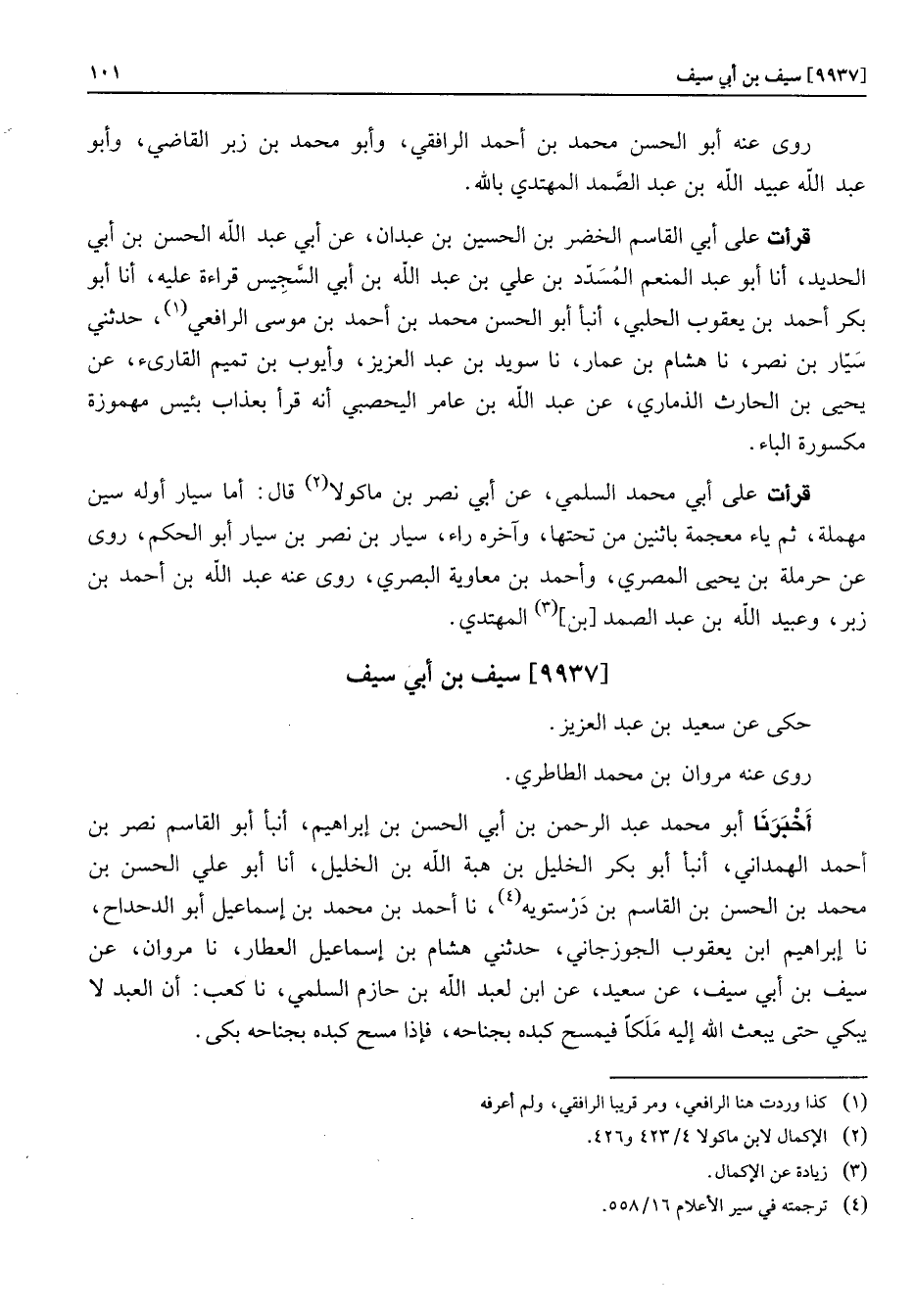 أخبرنا أبو محمد عبد الرحمن بن أبي الحسن بن إبراهيم، أنبأ أبو القاسم نصر بن أحمد الهمداني، أنبأ أبو بكر الخليل بن هبة الله بن الخليل، أنا أبو علي الحسن بن محمد بن الحسن بن القاسم بن درستويه «4» ، نا أحمد بن محمد بن إسماعيل أبو الدحداح، نا إبراهيم ابن يعقوب الجوزجاني، حدثني هشام بن إسماعيل العطار، نا مروان، عن سيف بن أبي سيف، عن سعيد، عن ابن لعبد الله بن حازم السلمي، نا كعب: أن العبد لا يبكي حتى يبعث الله إليه ملكا فيمسح كبده بجناحه، فإذا مسح كبده بجناحه بكى.