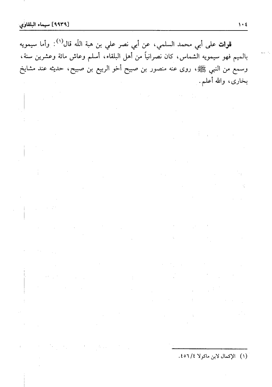 قرأت على أبي محمد السلمي، عن أبي نصر علي بن هبة الله قال «1» : وأما سيمويه بالميم فهو سيمويه الشماس، كان نصرانيا من أهل البلقاء، أسلم وعاش مائة وعشرين سنة، وسمع من النبي صلّى الله عليه وسلّم، روى عنه منصور بن صبيح أخو الربيع بن صبيح، حديثه عند مشايخ بخارى، والله أعلم.