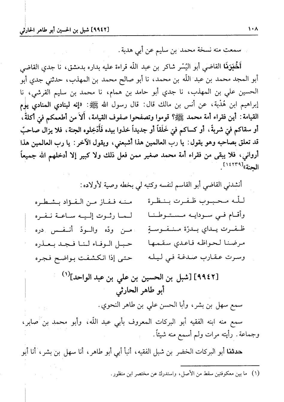 [9942] [شبل بن الحسين بن علي بن عبد الواحد] » أبو طاهر الحارثي
