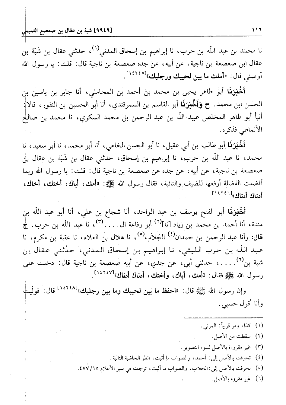 أنبأ أبو طاهر المخلص عبيد الله بن عبد الرحمن بن محمد السكري، نا محمد بن صالح الأنماطي فذكره. أخبرنا أبو طالب بن أبي عقيل، نا أبو الحسن الخلعي، أنا أبو محمد، نا أبو سعيد، نا محمد، نا عبد الله بن حرب، نا إبراهيم بن إسحاق، حدثني عقال بن شبّة بن عقال بن صعصعة بن ناجية، عن أبيه، عن جده عن صعصعة بن ناجية قال: قلت: يا رسول الله ربما أفضلت الفضلة أرفعها للضيف والنائبة، فقال رسول الله صلّى الله عليه وسلّم: «أمك، أباك، أختك، أخاك، أدناك أدناك»