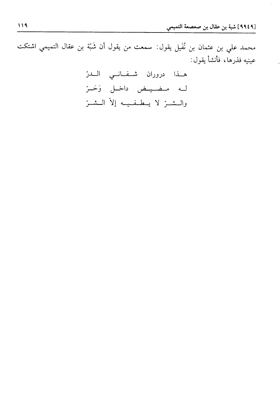 محمد علي بن عثمان بن نفيل يقول: سمعت من يقول أن شبّة بن عقال التميمي اشتكت عينيه فذرها، فأنشأ يقول: