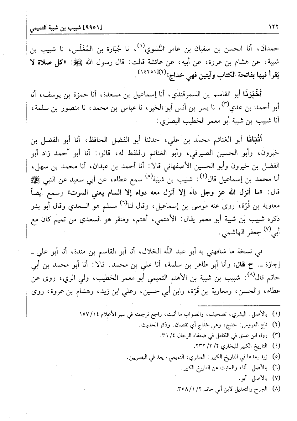 أنبأنا أبو الغنائم محمد بن علي، حدثنا أبو الفضل الحافظ، أنا أبو الفضل بن خيرون، وأبو الحسين الصيرفي، وأبو الغنائم واللفظ له، قالوا: أنا أبو أحمد زاد أبو الفضل بن خيرون وأبو الحسين الأصفهاني قالا: أنا أحمد بن عبدان، أنا محمد بن سهل، أنا محمد بن إسماعيل قال «4» : شبيب بن شيبة «5» سمع عطاء، عن أبي سعيد عن النبي صلّى الله عليه وسلّم قال: «ما أنزل الله عز وجل داء إلا أنزل معه دواء إلا السام يعني الموت» وسمع أيضا معاوية بن قرّة، روى عنه موسى بن إسماعيل، وقال لنا «6» مسلم هو السعدي وقال أبو بدر ذكره شبيب بن شيبة أبو معمر يقال: الأهتمي، أهتم، ومنقر هو السعدي من تميم كان مع أبي «7» جعفر الهاشمي.