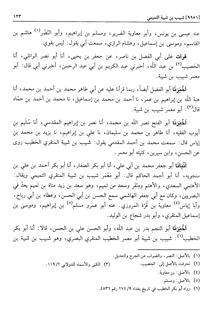 أخبرنا أبو النجم بدر بن عبد الله، وأبو الحسن علي بن الحسن، قالا: أنا أبو بكر الخطيب «6» : شبيب بن شيبة أبو معمر الخطيب المنقري البصري، وهو شبيب بن شيبة بن