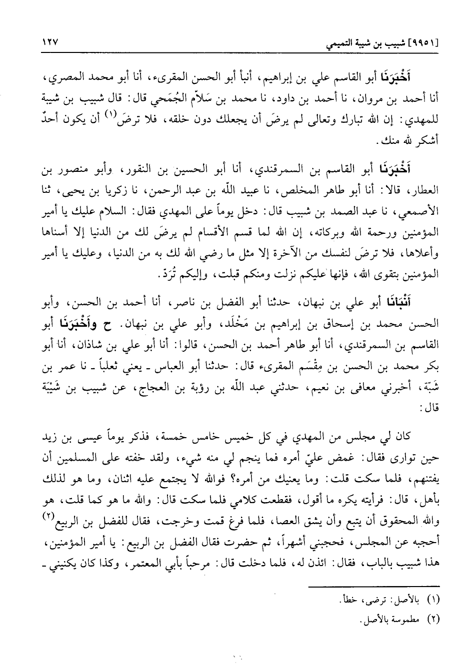 أنبأنا أبو علي بن نبهان، حدثنا أبو الفضل بن ناصر، أنا أحمد بن الحسن، وأبو الحسن محمد بن إسحاق بن إبراهيم بن مخلد، وأبو علي بن نبهان. ح وأخبرنا أبو القاسم بن السمرقندي، أنا أبو طاهر أحمد بن الحسن، قالوا: أنا أبو علي بن شاذان، أنا أبو بكر محمد بن الحسن بن مقسم المقرىء قال: حدثنا أبو العباس- يعني ثعلبا- نا عمر بن شبّة، أخبرني معافى بن نعيم، حدثني عبد الله بن رؤبة بن العجاج، عن شبيب بن شيبة قال: