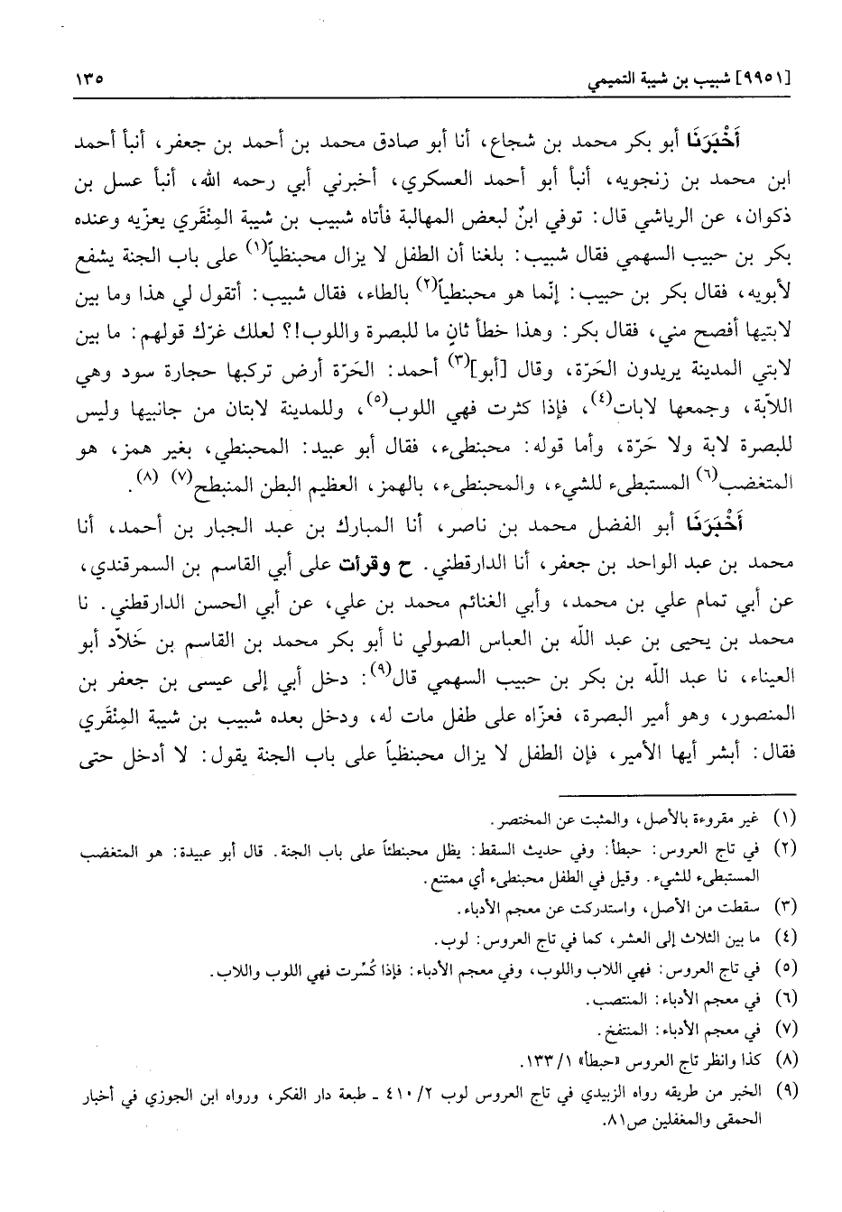 أخبرنا أبو الفضل محمد بن ناصر، أنا المبارك بن عبد الجبار بن أحمد، أنا محمد بن عبد الواحد بن جعفر، أنا الدارقطني. ح وقرأت على أبي القاسم بن السمرقندي، عن أبي تمام علي بن محمد، وأبي الغنائم محمد بن علي، عن أبي الحسن الدارقطني. نا محمد بن يحيى بن عبد الله بن العباس الصولي نا أبو بكر محمد بن القاسم بن خلّاد أبو العيناء، نا عبد الله بن بكر بن حبيب السهمي قال «9» : دخل أبي إلى عيسى بن جعفر بن المنصور، وهو أمير البصرة، فعزّاه على طفل مات له، ودخل بعده شبيب بن شيبة المنقري فقال: أبشر أيها الأمير، فإن الطفل لا يزال محبنظيا على باب الجنة يقول: لا أدخل حتى