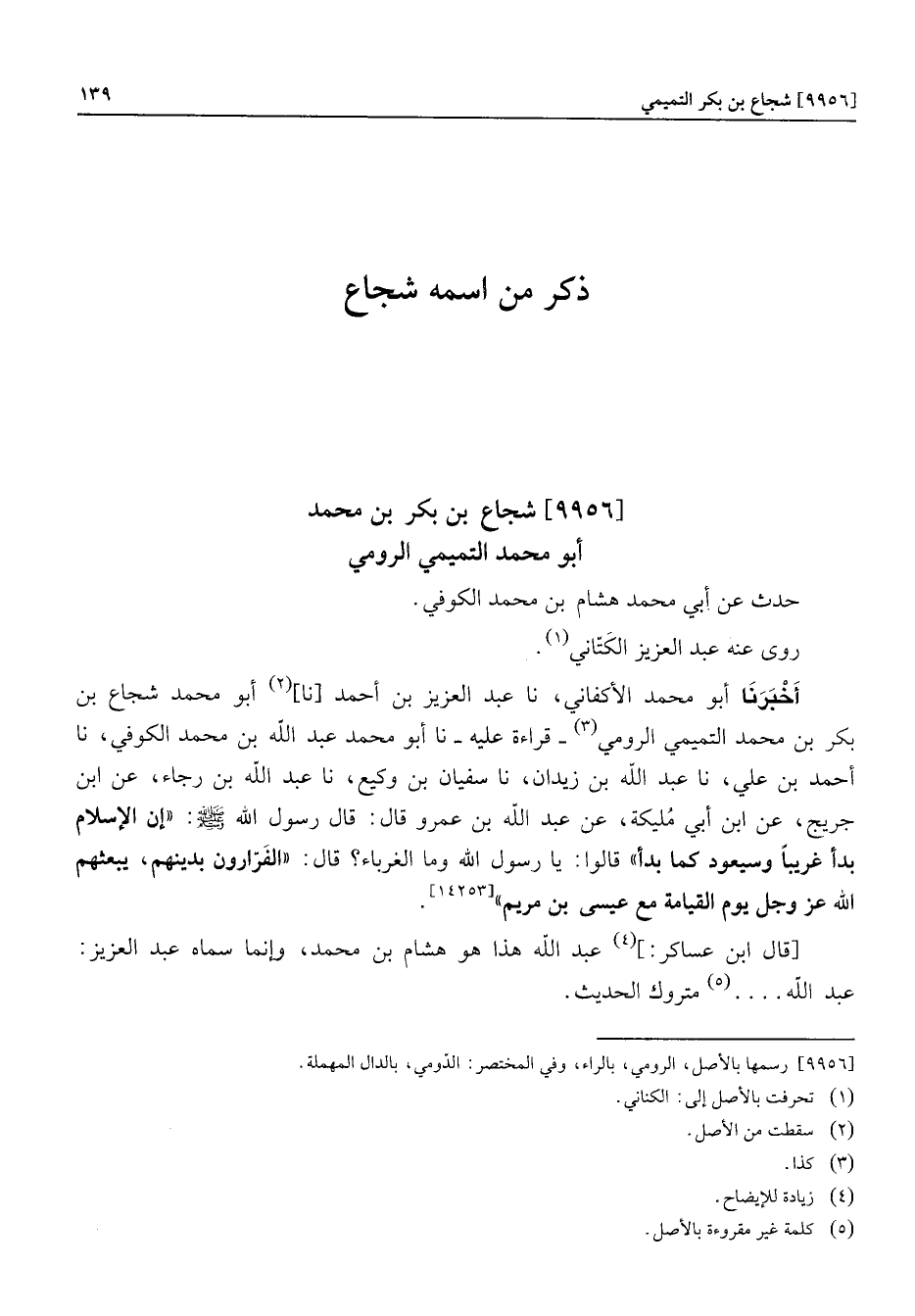 أخبرنا أبو محمد الأكفاني، نا عبد العزيز بن أحمد [نا] «2» أبو محمد شجاع بن بكر بن محمد التميمي الرومي «3» - قراءة عليه- نا أبو محمد عبد الله بن محمد الكوفي، نا أحمد بن علي، نا عبد الله بن زيدان، نا سفيان بن وكيع، نا عبد الله بن رجاء، عن ابن جريج، عن ابن أبي مليكة، عن عبد الله بن عمرو قال: قال رسول الله صلّى الله عليه وسلّم: «إن الإسلام بدأ غريبا وسيعود كما بدأ» قالوا: يا رسول الله وما الغرباء؟ قال: «الفرّارون بدينهم، يبعثهم الله عز وجل يوم القيامة مع عيسى بن مريم»