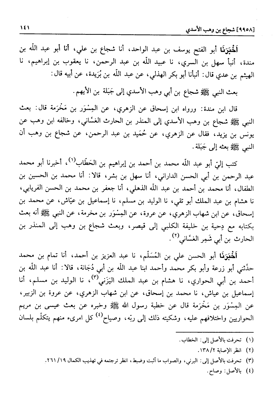 كتب إليّ أبو عبد الله محمد بن أحمد بن إبراهيم بن الحطّاب «1» ، أخبرنا أبو محمد عبد الرحمن بن أبي الحسن الداراني، أنا سهل بن بشر، قالا: أنا محمد بن الحسين بن الطفال، أنا محمد بن أحمد بن عبد الله الذهلي، أنا جعفر بن محمد بن الحسن الفريابي، نا هشام بن عبد الملك أبو تقي، نا الوليد بن مسلم، نا إسماعيل بن عيّاش، عن محمد بن إسحاق، عن ابن شهاب الزهري، عن عروة، عن المسور بن مخرمة، عن النبي صلى الله عليه وسلّم أنه بعث بكتابه مع دحية بن خليفة الكلبي إلى قيصر، وبعث شجاع بن وهب إلى المنذر بن الحارث بن أبي شمر الغسّاني «2» .