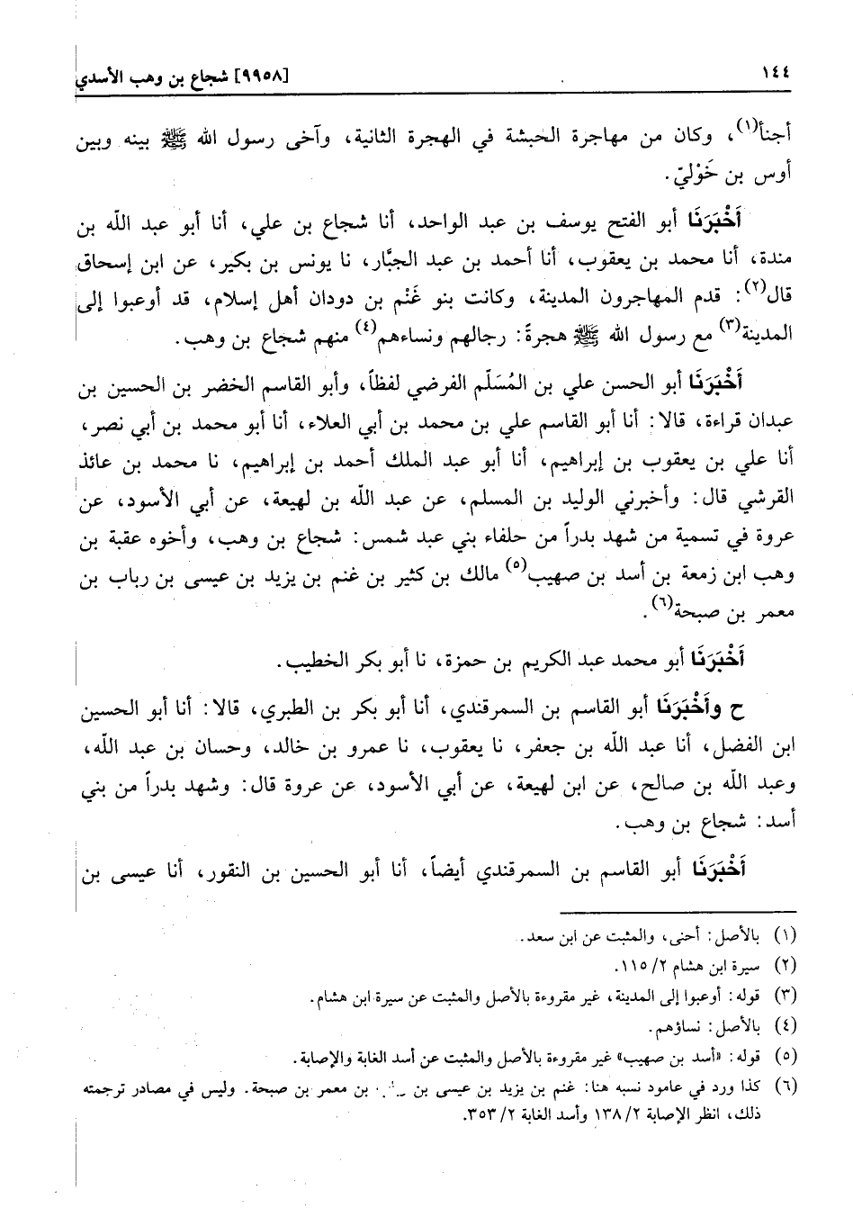 ح وأخبرنا أبو القاسم بن السمرقندي، أنا أبو بكر بن الطبري، قالا: أنا أبو الحسين ابن الفضل، أنا عبد الله بن جعفر، نا يعقوب، نا عمرو بن خالد، وحسان بن عبد الله، وعبد الله بن صالح، عن ابن لهيعة، عن أبي الأسود، عن عروة قال: وشهد بدرا من بني أسد: شجاع بن وهب.