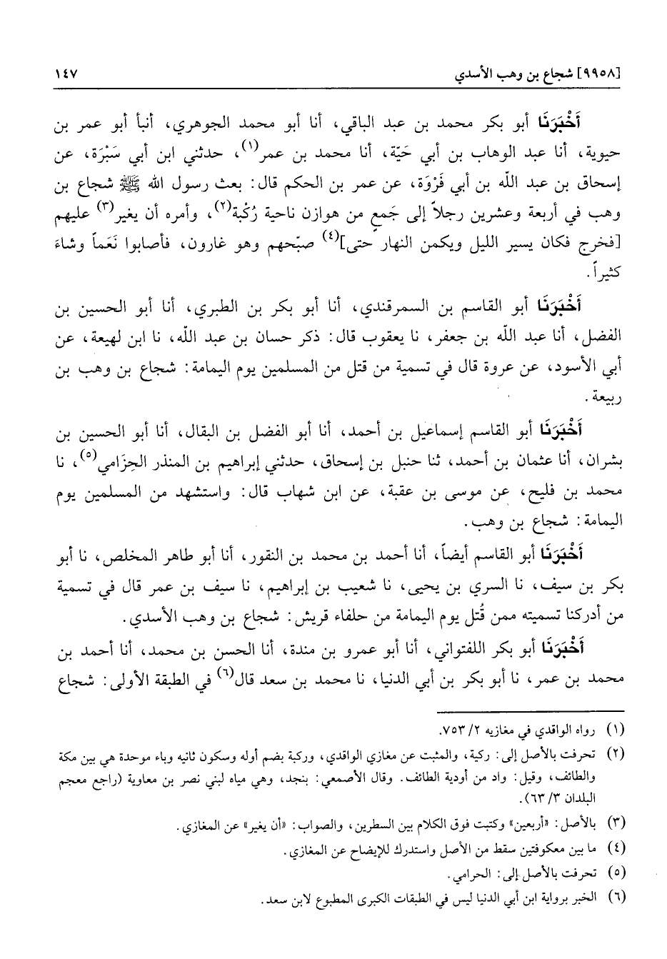 أخبرنا أبو القاسم أيضا، أنا أحمد بن محمد بن النقور، أنا أبو طاهر المخلص، نا أبو بكر بن سيف، نا السري بن يحيى، نا شعيب بن إبراهيم، نا سيف بن عمر قال في تسمية من أدركنا تسميته ممن قتل يوم اليمامة من حلفاء قريش: شجاع بن وهب الأسدي.