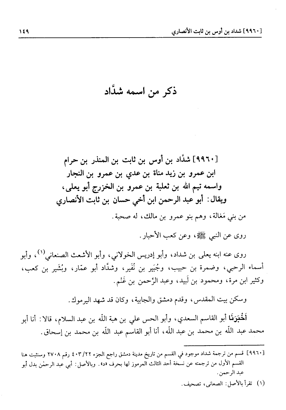 [9960] قسم من ترجمة شداد موجود في القسم من تاريخ مدينة دمشق راجع الجزء 22/403 رقم 2708 وسنثبت هنا القسم الأول من ترجمته عن نسخة أحد الثالث المرموز لها بحرف «د» . وبالأصل: أبي عبد الرحمن بدل أبو عبد الرحمن.