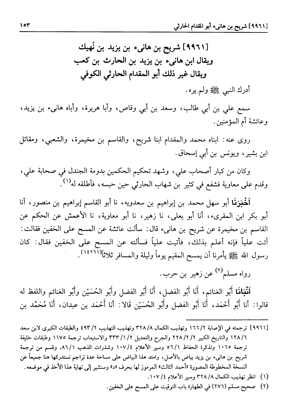 [9961] ترجمته في الإصابة 2/166 وتهذيب الكمال 8/328 وتهذيب التهذيب 2/493 والطبقات الكبرى لابن سعد 6/128 والتاريخ الكبير 2/2/228 والجرح والتعديل 2/1/333 والاستيعاب ترجمة 1175 وطبقات خليفة ترجمة 1065 وتذكرة الحفاظ 1/56 وسير الأعلام 4/107 وشذرات الذهب 1/86. وقسم من ترجمة شريح بن هانىء بن يزيد بياض بالأصل، وامتد هذا البياض على مساحة عدة تراجم نستدركها هنا جميعا عن النسخة المخطوطة المصورة «أحمد الثالث» المرموز لها بحرف «د» وسنشير إلى نهاية هذا الأخذ في موضعه.