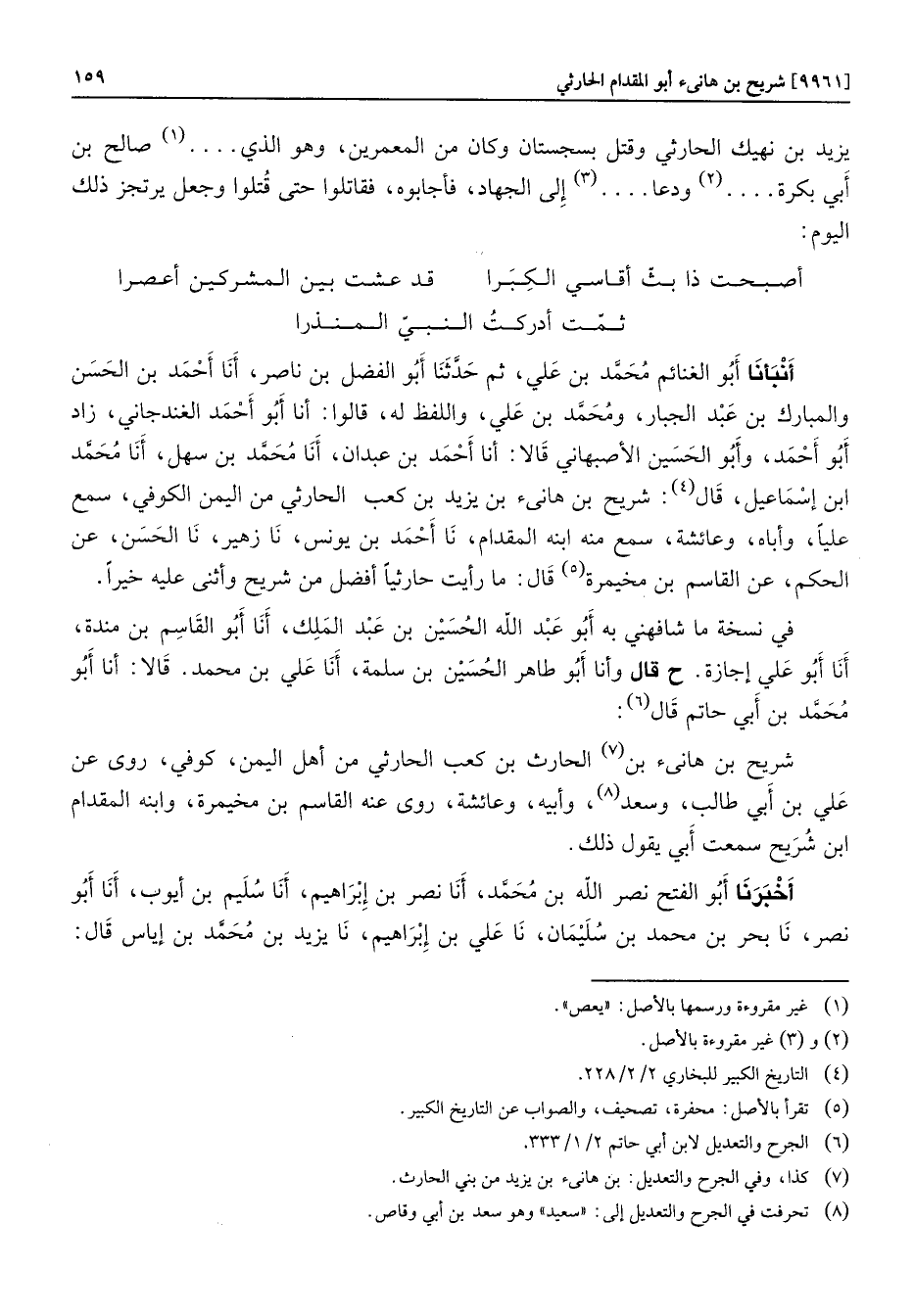 أنبأنا أبو الغنائم محمّد بن علي، ثم حدّثنا أبو الفضل بن ناصر، أنا أحمد بن الحسن والمبارك بن عبد الجبار، ومحمّد بن علي، واللفظ له، قالوا: أنا أبو أحمد الغندجاني، زاد أبو أحمد، وأبو الحسين الأصبهاني قالا: أنا أحمد بن عبدان، أنا محمّد بن سهل، أنا محمّد ابن إسماعيل، قال «4» : شريح بن هانىء بن يزيد بن كعب الحارثي من اليمن الكوفي، سمع عليا، وأباه، وعائشة، سمع منه ابنه المقدام، نا أحمد بن يونس، نا زهير، نا الحسن، عن الحكم، عن القاسم بن مخيمرة «5» قال: ما رأيت حارثيا أفضل من شريح وأثنى عليه خيرا.
