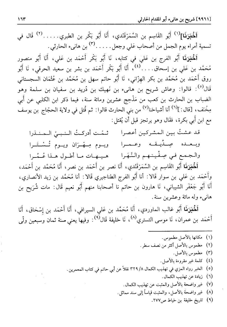أخبرنا] «1» أبو القاسم بن السمرقندي، أنا أبو بكر بن الطبري..... «2» قال في تسمية أمراء يوم الجمل من أصحاب علي وجعل..... «3» بن هانىء الحارثي.