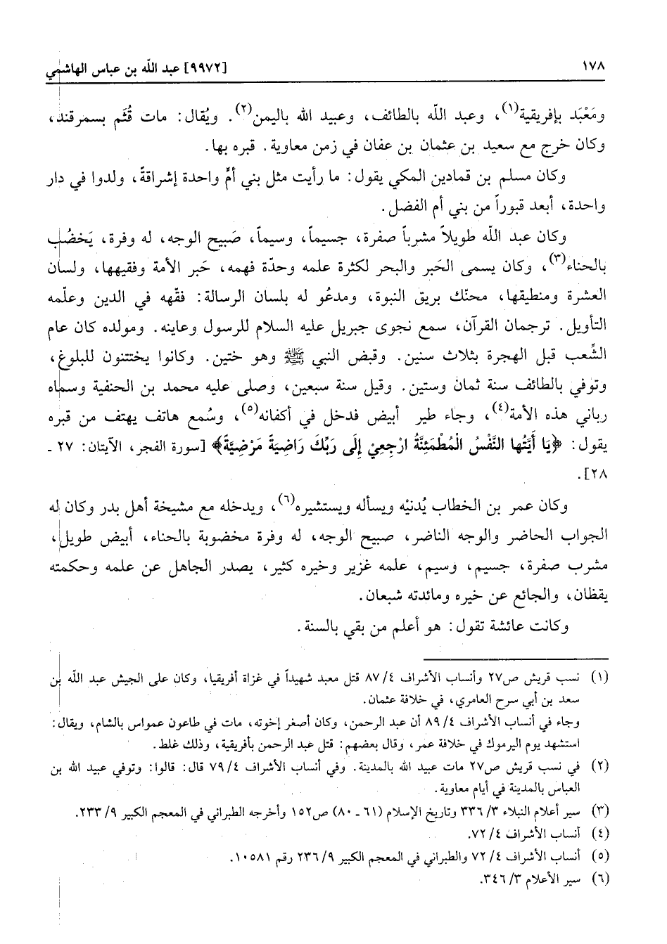 وكان عبد الله طويلا مشربا صفرة، جسيما، وسيما، صبيح الوجه، له وفرة، يخضب بالحناء «3» ، وكان يسمى الحبر والبحر لكثرة علمه وحدّة فهمه، حبر الأمة وفقيهها، ولسان العشرة ومنطيقها، محنّك بريق النبوة، ومدعو له بلسان الرسالة: فقّهه في الدين وعلّمه التأويل. ترجمان القرآن، سمع نجوى جبريل عليه السلام للرسول وعاينه. ومولده كان عام الشّعب قبل الهجرة بثلاث سنين. وقبض النبي صلّى الله عليه وسلّم وهو ختين. وكانوا يختتنون للبلوغ، وتوفي بالطائف سنة ثمان وستين. وقيل سنة سبعين، وصلى عليه محمد بن الحنفية وسماه رباني هذه الأمة «4» ، وجاء طير أبيض فدخل في أكفانه «5» ، وسمع هاتف يهتف من قبره يقول: يا أَيَّتُهَا النَّفْسُ الْمُطْمَئِنَّةُ ارْجِعِي إِلى رَبِّكِ راضِيَةً مَرْضِيَّةً