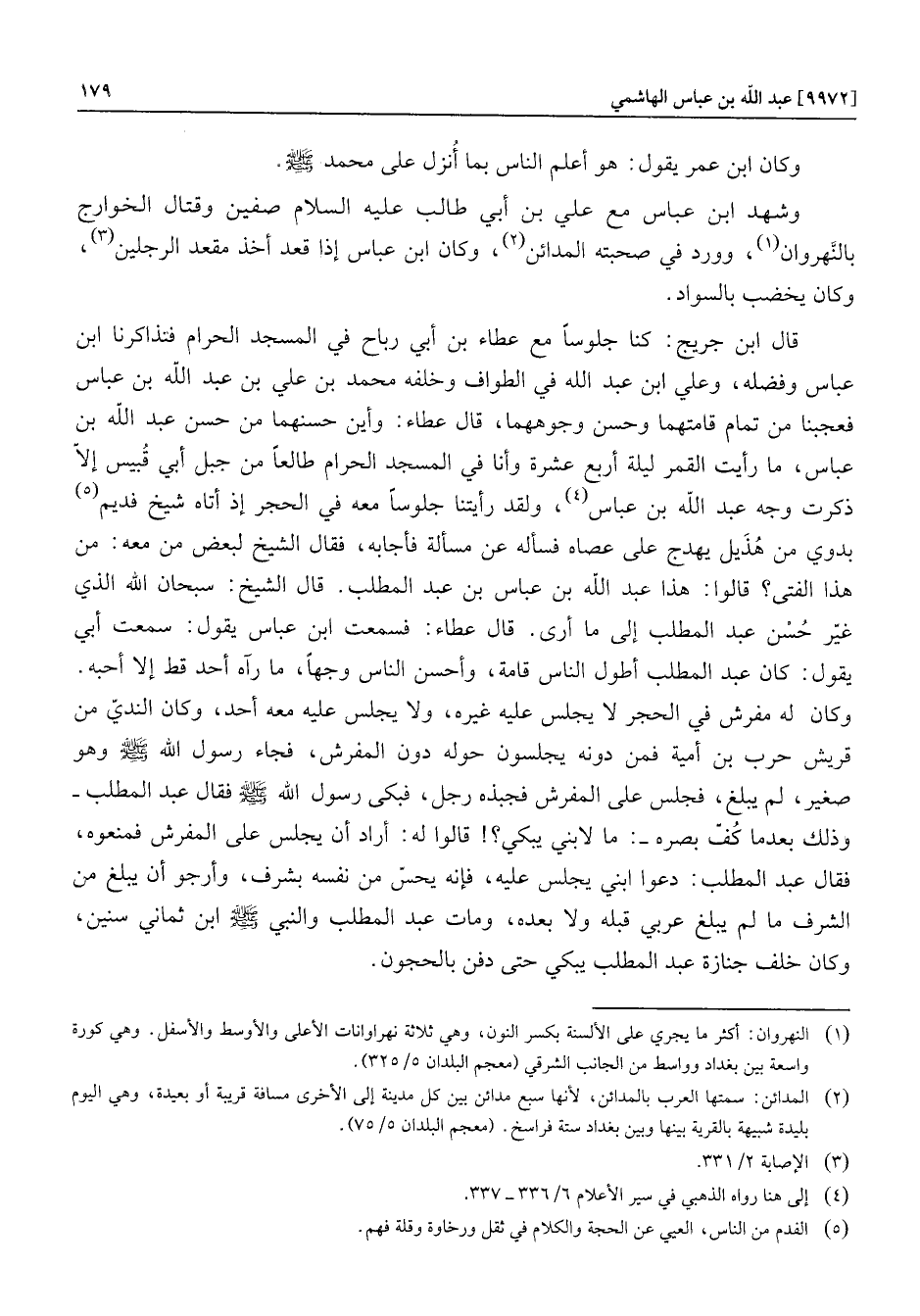 وشهد ابن عباس مع علي بن أبي طالب عليه السلام صفين وقتال الخوارج بالنّهروان «1» ، وورد في صحبته المدائن «2» ، وكان ابن عباس إذا قعد أخذ مقعد الرجلين «3» ، وكان يخضب بالسواد.
