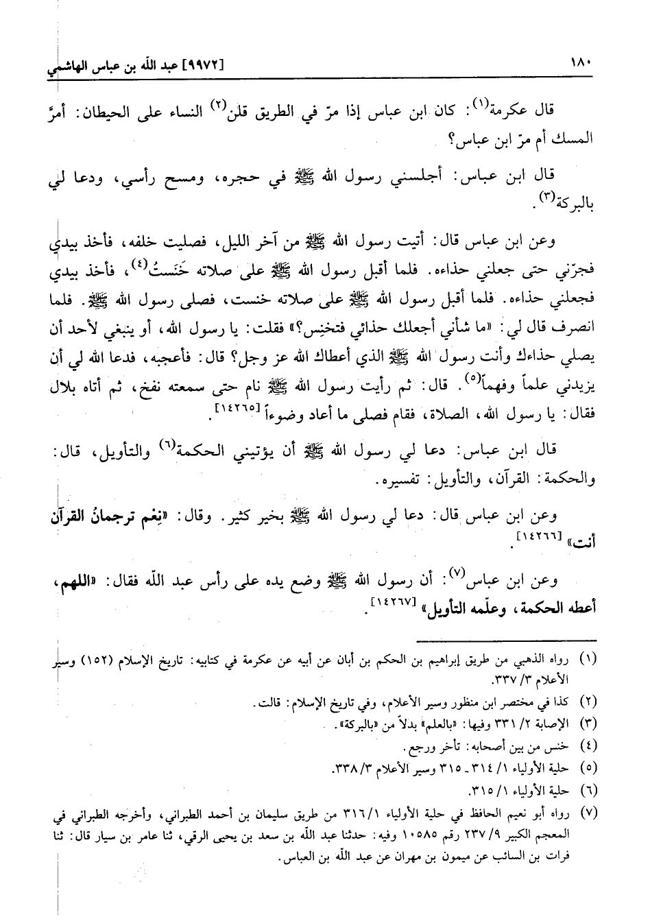 وعن ابن عباس قال: دعا لي رسول الله صلّى الله عليه وسلّم بخير كثير. وقال: «نعم ترجمان القرآن أنت»