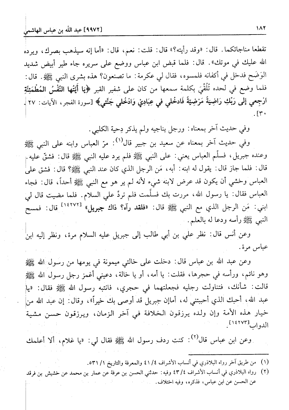 قال: فلما جاز قال: يقول له ابنه: أبه، من الرجل الذي كان عند النبي صلّى الله عليه وسلّم؟ قال: فشق على العباس وخشي أن يكون قد عرض لابنه شيء لأنه لم ير هو مع النبي صلّى الله عليه وسلّم أحدا، قال: فجاء العباس فقال: يا رسول الله، مررت بك فسلّمت فلم تردّ علي السلام. فلما مضيت قال لي ابني: من الرجل الذي مع النبي صلّى الله عليه وسلّم قال: «فلقد رآه؟ ذاك جبريل»