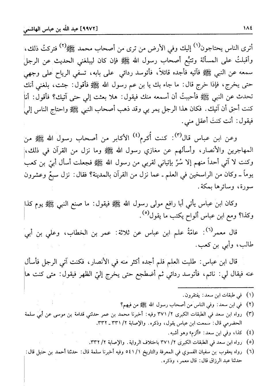 أترى الناس يحتاجون «1» إليك وفي الأرض من ترى من أصحاب محمد صلّى الله عليه وسلّم «2» فتركت ذلك، وأقبلت على المسألة وتتبّع أصحاب رسول الله صلّى الله عليه وسلّم فإن كان ليبلغني الحديث عن الرجل سمعه عن النبي صلّى الله عليه وسلّم فآتيه فأجده قائلا، فأتوسد ردائي على بابه، تسفي الرياح على وجهي حتى يخرج، فإذا خرج قال: ما جاء بك يا بن عم رسول الله صلّى الله عليه وسلّم فأقول: جئت، بلغني أنك تحدث عن النبي صلّى الله عليه وسلّم فأحببت أن أسمعه منك فيقول: هلا بعثت إلي حتى آتيك؟ فأقول: أنا كنت أحق أن آتيك. فكان هذا الرجل يمر بي وقد ذهب أصحاب النبي صلّى الله عليه وسلّم واحتاج الناس إلي فيقول: أنت كنت أعقل مني.