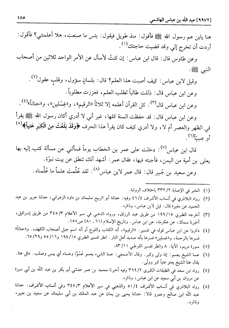 وعن ابن عباس قال: قد حفظت السنة كلها، غير أني لا أدري أكان رسول الله صلّى الله عليه وسلّم يقرأ في الظهر والعصر أم لا، ولا أدري كيف كان يقرأ هذا الحرف وَقَدْ بَلَغْتُ مِنَ الْكِبَرِ عِتِيًّا