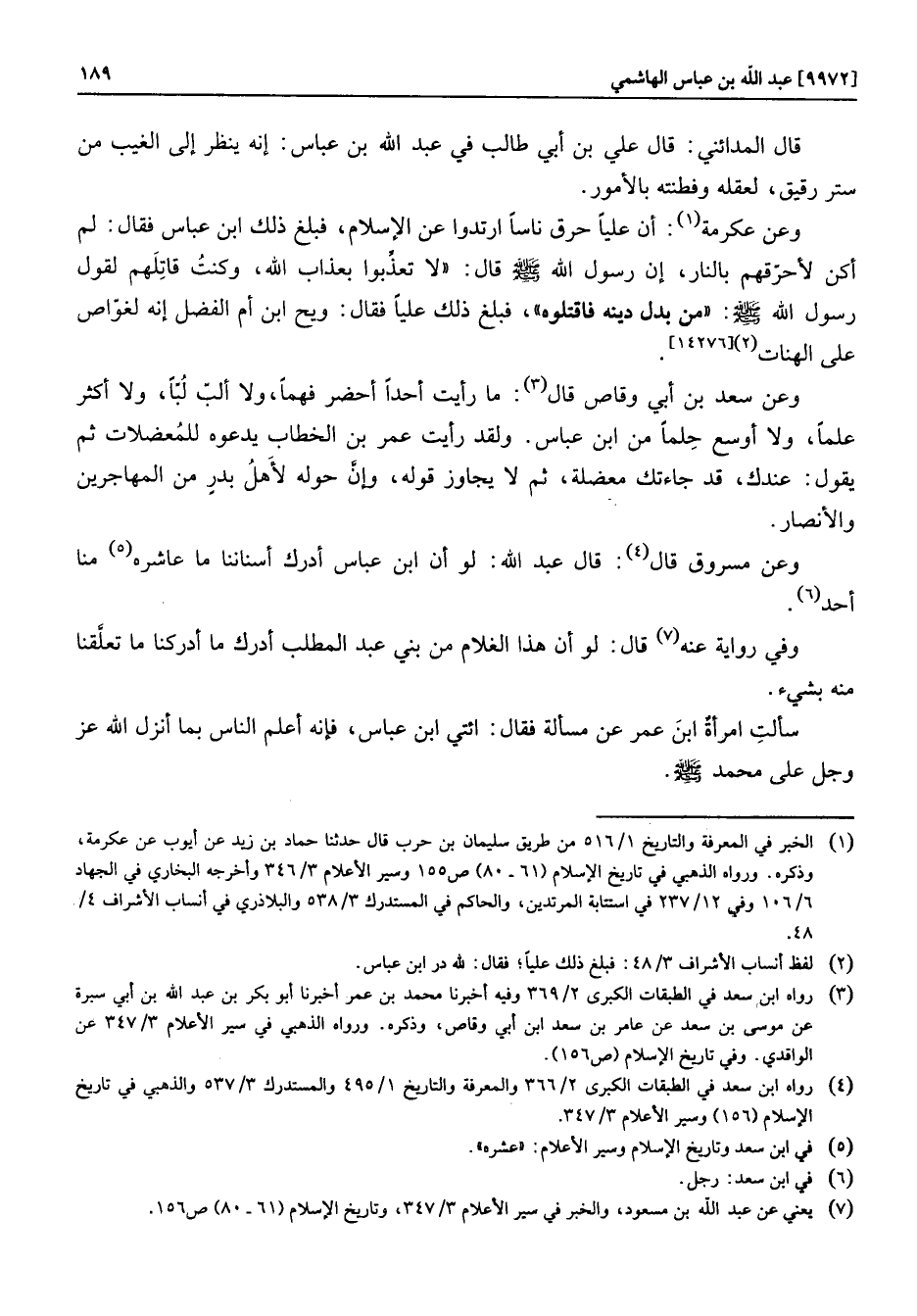 قال المدائني: قال علي بن أبي طالب في عبد الله بن عباس: إنه ينظر إلى الغيب من ستر رقيق، لعقله وفطنته بالأمور. وعن عكرمة «1» : أن عليا حرق ناسا ارتدوا عن الإسلام، فبلغ ذلك ابن عباس فقال: لم أكن لأحرّقهم بالنار، إن رسول الله صلّى الله عليه وسلّم قال: «لا تعذّبوا بعذاب الله، وكنت قاتلهم لقول رسول الله صلّى الله عليه وسلّم: «من بدل دينه فاقتلوه» ، فبلغ ذلك عليا فقال: ويح ابن أم الفضل إنه لغوّاص على الهنات «2»