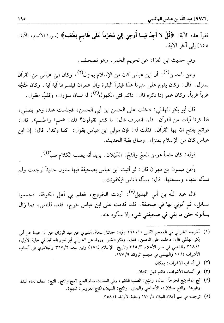 وعن الحسن «1» : أن ابن عباس كان من الإسلام بمنزل «2» ، وكان ابن عباس من القرآن بمنزل. قال: وكان يقوم على منبرنا هذا فيقرأ البقرة وآل عمران فيفسرها آية آية. وكان مثجّه غربا غربا، وكان عمر إذا ذكره قال: ذاكم فتى الكهول «3» ، له لسان سؤول، وقلب عقول.