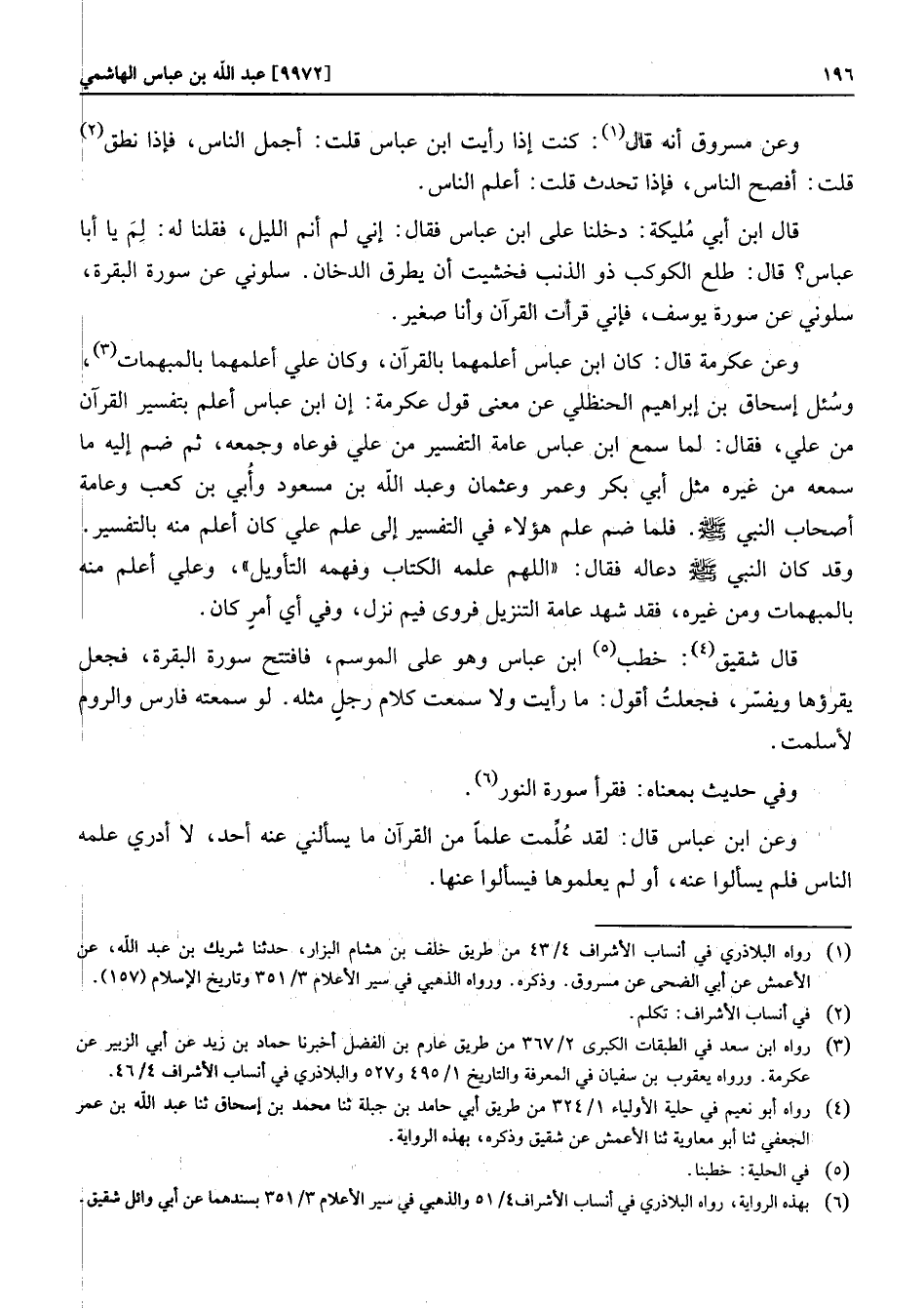 وعن عكرمة قال: كان ابن عباس أعلمهما بالقرآن، وكان علي أعلمهما بالمبهمات «3» ، وسئل إسحاق بن إبراهيم الحنظلي عن معنى قول عكرمة: إن ابن عباس أعلم بتفسير القرآن من علي، فقال: لما سمع ابن عباس عامة التفسير من علي فوعاه وجمعه، ثم ضم إليه ما سمعه من غيره مثل أبي بكر وعمر وعثمان وعبد الله بن مسعود وأبي بن كعب وعامة أصحاب النبي صلّى الله عليه وسلّم. فلما ضم علم هؤلاء في التفسير إلى علم علي كان أعلم منه بالتفسير.