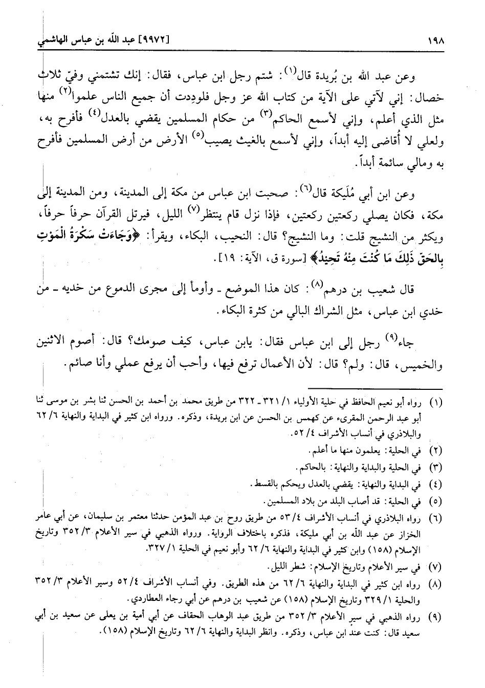 وعن عبد الله بن بريدة قال «1» : شتم رجل ابن عباس، فقال: إنك تشتمني وفيّ ثلاث خصال: إني لآتي على الآية من كتاب الله عز وجل فلوددت أن جميع الناس علموا «2» منها مثل الذي أعلم، وإني لأسمع الحاكم «3» من حكام المسلمين يقضي بالعدل «4» فأفرح به، ولعلي لا أقاضى إليه أبدا، وإني لأسمع بالغيث يصيب «5» الأرض من أرض المسلمين فأفرح به ومالي سائمة أبدا.