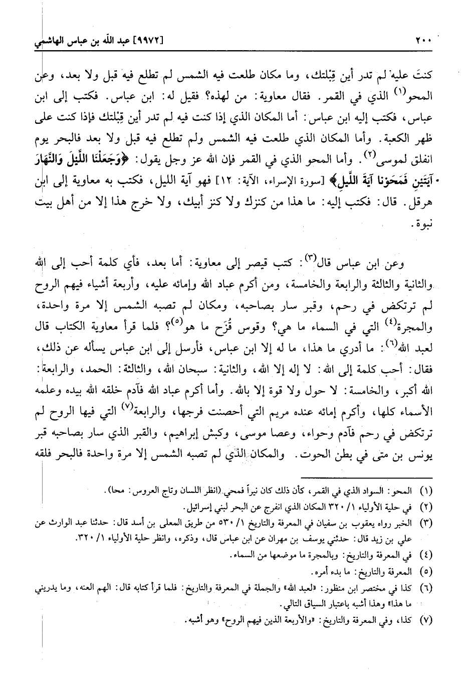 [سورة الإسراء، الآية: 12] فهو آية الليل، فكتب به معاوية إلى ابن هرقل. قال: فكتب إليه: ما هذا من كنزك ولا كنز أبيك، ولا خرج هذا إلا من أهل بيت نبوة. وعن ابن عباس قال «3» : كتب قيصر إلى معاوية: أما بعد، فأي كلمة أحب إلى الله والثانية والثالثة والرابعة والخامسة، ومن أكرم عباد الله وإمائه عليه، وأربعة أشياء فيهم الروح لم ترتكض في رحم، وقبر سار بصاحبه، ومكان لم تصبه الشمس إلا مرة واحدة، والمجرة «4» التي في السماء ما هي؟ وقوس قزح ما هو «5» ؟ فلما قرأ معاوية الكتاب قال لعبد الله «6» : ما أدري ما هذا، ما له إلا ابن عباس، فأرسل إلى ابن عباس يسأله عن ذلك، فقال: أحب كلمة إلى الله: لا إله إلا الله، والثانية: سبحان الله، والثالثة: الحمد، والرابعة: