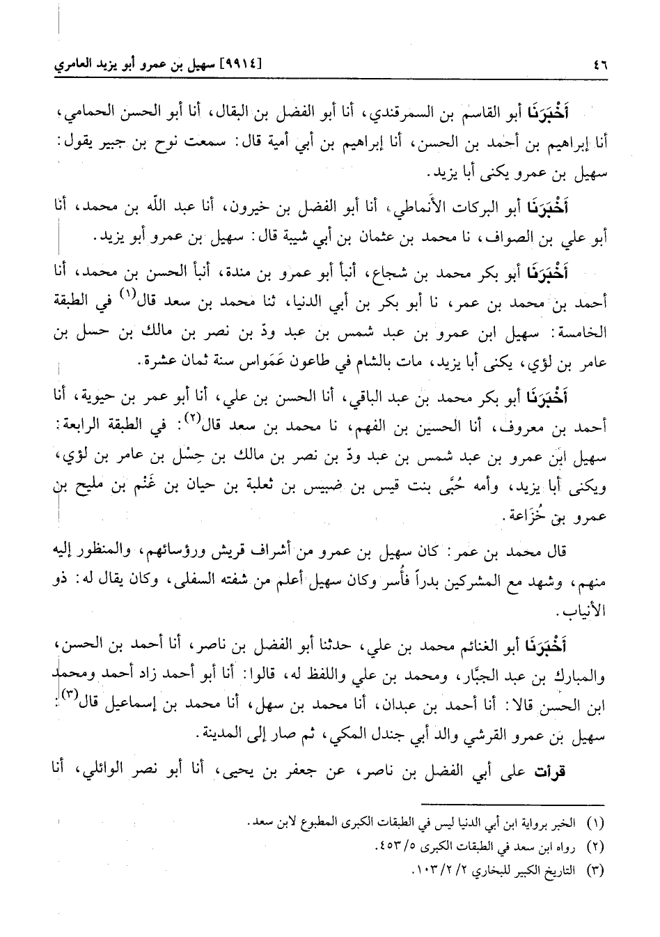 أخبرنا أبو البركات الأنماطي، أنا أبو الفضل بن خيرون، أنا عبد الله بن محمد، أنا أبو علي بن الصواف، نا محمد بن عثمان بن أبي شيبة قال: سهيل بن عمرو أبو يزيد.