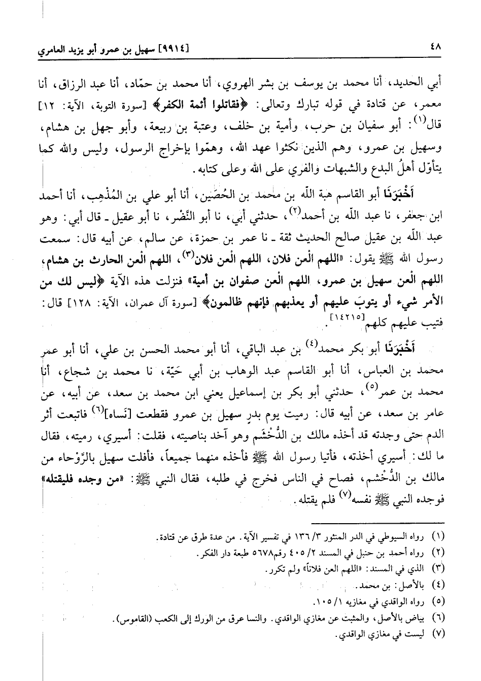 أخبرنا أبو بكر محمد «4» بن عبد الباقي، أنا أبو محمد الحسن بن علي، أنا أبو عمر محمد بن العباس، أنا أبو القاسم عبد الوهاب بن أبي حيّة، نا محمد بن شجاع، أنا محمد بن عمر «5» ، حدثني أبو بكر بن إسماعيل يعني ابن محمد بن سعد، عن أبيه، عن عامر بن سعد، عن أبيه قال: رميت يوم بدر سهيل بن عمرو فقطعت [نساه] «6» فاتبعت أثر الدم حتى وجدته قد أخذه مالك بن الدّخشم وهو آخد بناصيته، فقلت: أسيري، رميته، فقال مالك: أسيري أخذته، فأتيا رسول الله صلّى الله عليه وسلّم فأخذه منهما جميعا، فأفلت سهيل بالرّوحاء من مالك بن الدّخشم، فصاح في الناس فخرج في طلبه، فقال النبي صلّى الله عليه وسلّم: «من وجده فليقتله» فوجده النبي صلّى الله عليه وسلّم نفسه «7» فلم يقتله.