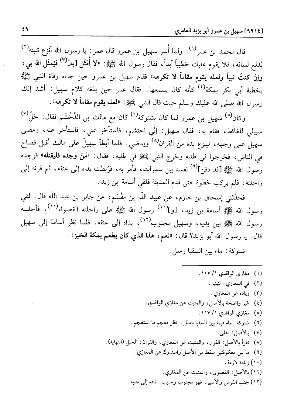قال محمد بن عمر «1» : ولما أسر سهيل بن عمرو قال عمر: يا رسول الله أنزع ثنيته «2» يدلع لسانه، فلا يقوم عليك خطيبا أبدا، فقال رسول الله صلّى الله عليه وسلّم: «لا أمثّل [به] «3» فيمثّل الله بي، وإن كنت نبيا ولعله يقوم مقاما لا تكرهه» فقام سهيل بن عمرو حين جاءه وفاة النبي صلّى الله عليه وسلّم بخطبة أبي بكر بمكة «4» كأنه كان يسمعها. فقال عمر حين بلغه كلام سهيل: أشد إنك رسول الله صلى الله عليك وسلم حيث قال النبي صلّى الله عليه وسلّم: «لعله يقوم مقاما لا تكرهه» . وكان «5» سهيل بن عمرو لما كان بشنوكة «6» كان مع مالك بن الدّخشم فقال: خلّ «7» سبيلي للغائط، فقام به، فقال سهيل: إنّي احتشم، فاستأخر عني، فاستأخر عنه، ومضى سهيل على وجهه، لينزع يده من القران «8» ويمضي. فلما أبطأ سهيل على مالك أقبل فصاح في الناس، فخرجوا في طلبه وخرج النبي صلّى الله عليه وسلّم في طلبه، فقال: «من وجده فليقتله» فوجده رسول الله صلّى الله عليه وسلّم [قد دفن] «9» نفسه بين سمرات، فأمر به، فربطت يداه إلى عنقه، ثم قرنه إلى راحلته، فلم يركب خطوة حتى قدم المدينة فلقي أسامة بن زيد.