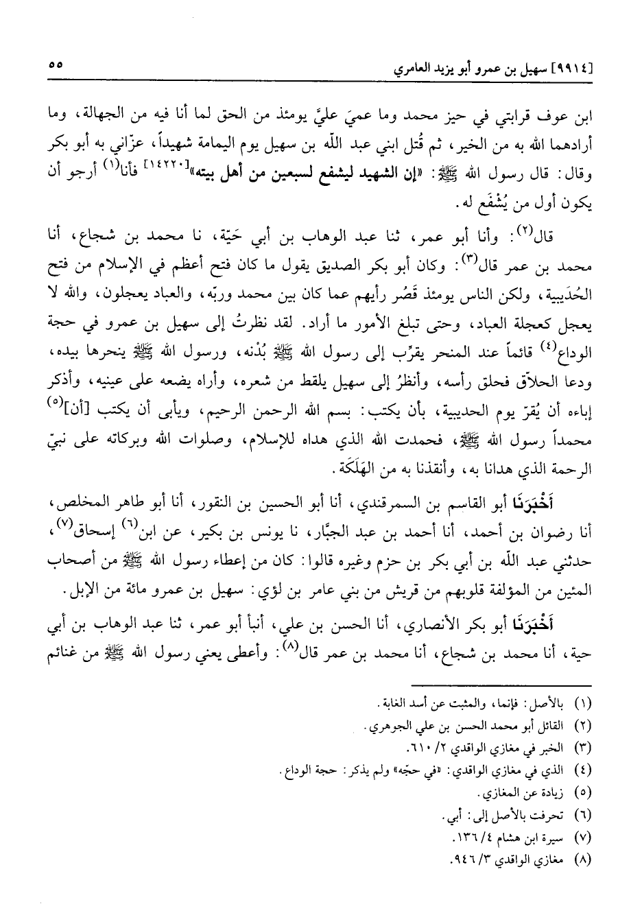 ابن عوف قرابتي في حيز محمد وما عمي عليّ يومئذ من الحق لما أنا فيه من الجهالة، وما أرادهما الله به من الخير، ثم قتل ابني عبد الله بن سهيل يوم اليمامة شهيدا، عزّاني به أبو بكر وقال: قال رسول الله صلّى الله عليه وسلّم: «إن الشهيد ليشفع لسبعين من أهل بيته»