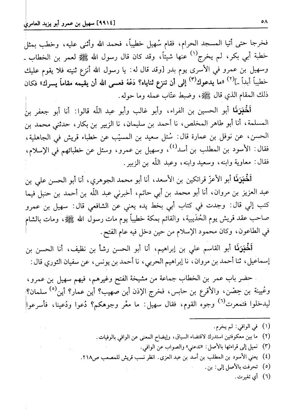 أخبرنا أبو الحسين بن الفراء، وأبو غالب وأبو عبد الله قالوا: أنا أبو جعفر بن المسلمة، أنا أبو طاهر المخلص، نا أحمد بن سليمان، نا الزبير بن بكار، حدثني محمد بن الحسن، عن نوفل بن عمارة قال: سئل سعيد بن المسيّب عن خطباء قريش في الجاهلية، فقال: الأسود بن المطلب بن أسد «4» ، وسهيل بن عمرو، وسئل عن خطبائهم في الإسلام، فقال: معاوية وابنه، وسعيد وابنه، وعبد الله بن الزبير. أخبرنا أبو الأعزّ قراتكين بن الأسعد، أنا أبو محمد الجوهري، أنا أبو الحسن علي بن عبد العزيز بن مروان، أنا أبو محمد بن أبي حاتم، أخبرني عبد الله بن أحمد بن حنبل فيما كتب إلي قال: وجدت في كتاب أبي بخط يده يعني عن الشافعي قال: سهيل بن عمرو صاحب عقد قريش يوم الحديبية، والقائم بمكة خطيبا يوم مات رسول الله صلّى الله عليه وسلّم، ومات بالشام في الطاعون، وكان محمود الإسلام من حين دخل فيه عام الفتح.