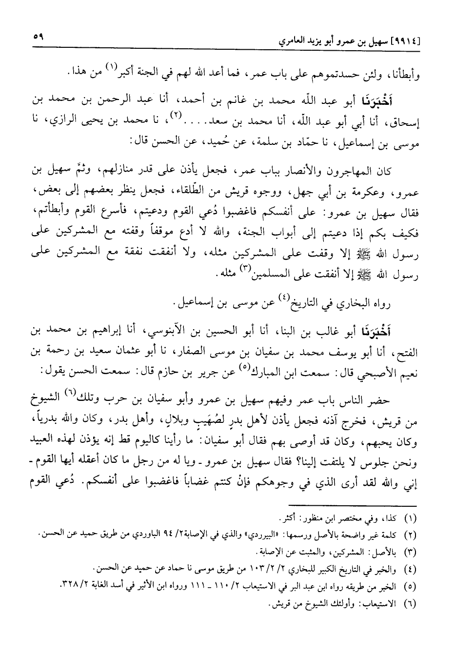 أخبرنا أبو عبد الله محمد بن غانم بن أحمد، أنا عبد الرحمن بن محمد بن إسحاق، أنا أبي أبو عبد الله، أنا محمد بن سعد.... «2» ، نا محمد بن يحيى الرازي، نا موسى بن إسماعيل، نا حمّاد بن سلمة، عن حميد، عن الحسن قال: كان المهاجرون والأنصار بباب عمر، فجعل يأذن على قدر منازلهم، وثمّ سهيل بن عمرو، وعكرمة بن أبي جهل، ووجوه قريش من الطّلقاء، فجعل ينظر بعضهم إلى بعض، فقال سهيل بن عمرو: على أنفسكم فاغضبوا دعي القوم ودعيتم، فأسرع القوم وأبطأتم، فكيف بكم إذا دعيتم إلى أبواب الجنة، والله لا أدع موقفا وقفته مع المشركين على رسول الله صلّى الله عليه وسلّم إلا وقفت على المشركين مثله، ولا أنفقت نفقة مع المشركين على رسول الله صلّى الله عليه وسلّم إلا أنفقت على المسلمين «3» مثله.