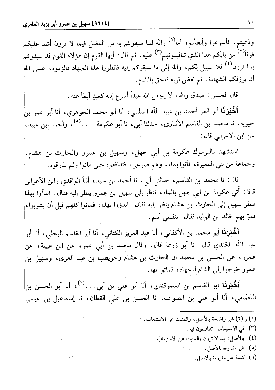 أخبرنا أبو العز أحمد بن عبيد الله السلمي، أنا أبو محمد الجوهري، أنا أبو عمر بن حيوية، نا محمد بن القاسم الأنباري، حدثنا أبي، نا أبو عكرمة.... «5» ، وأحمد بن عبيد، عن ابن الأعرابي قال: استشهد باليرموك عكرمة بن أبي جهل، وسهيل بن عمرو والحارث بن هشام، وجماعة من بني المغيرة، فأتوا بماء، وهم صرعى، فتدافعوه حتى ماتوا ولم يذوقوه.