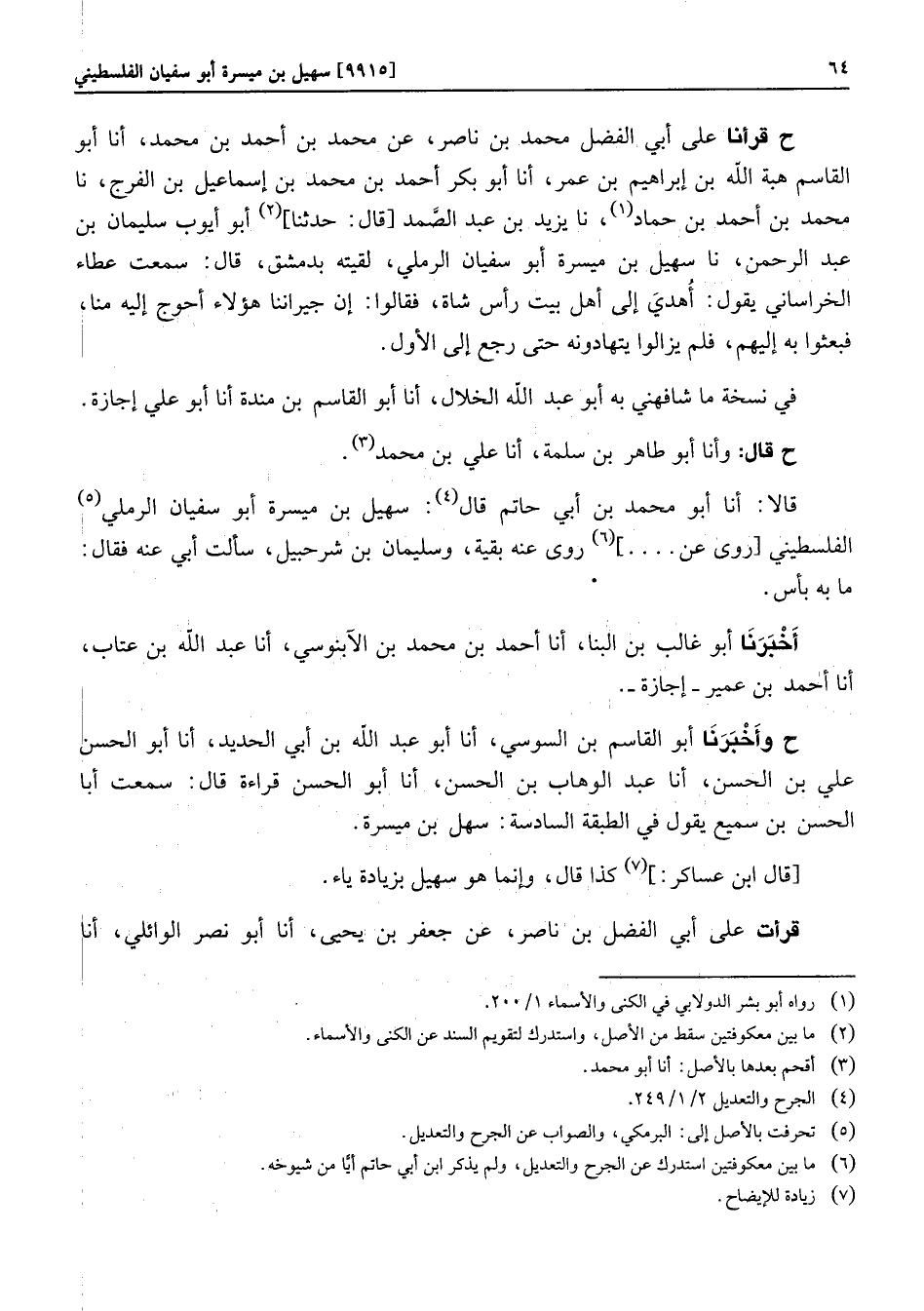 ح وأخبرنا أبو القاسم بن السوسي، أنا أبو عبد الله بن أبي الحديد، أنا أبو الحسن علي بن الحسن، أنا عبد الوهاب بن الحسن، أنا أبو الحسن قراءة قال: سمعت أبا الحسن بن سميع يقول في الطبقة السادسة: سهل بن ميسرة.