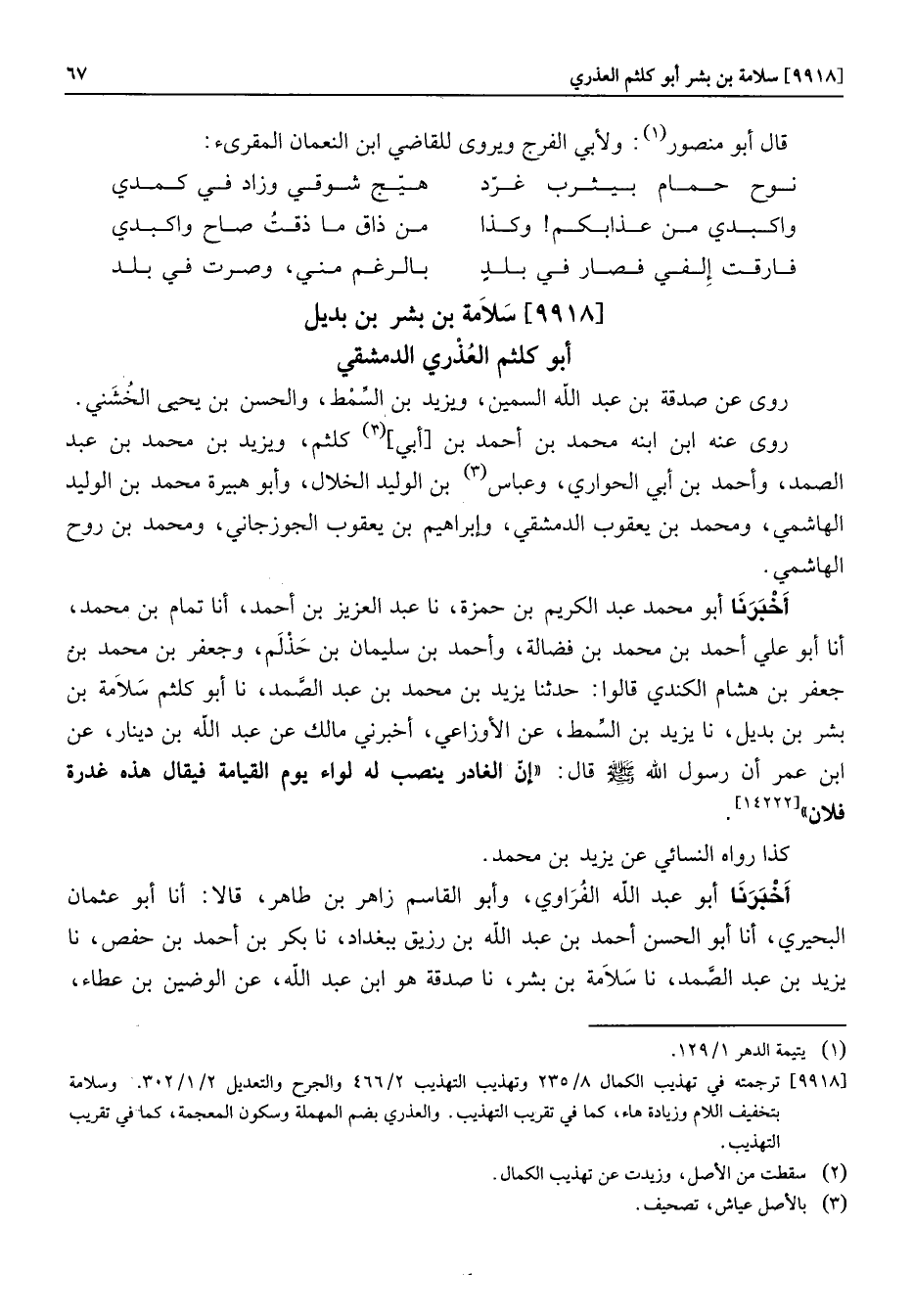 [9918] ترجمته في تهذيب الكمال 8/235 وتهذيب التهذيب 2/466 والجرح والتعديل 2/1/302. وسلامة بتخفيف اللام وزيادة هاء، كما في تقريب التهذيب. والعذري بضم المهملة وسكون المعجمة، كما في تقريب التهذيب.