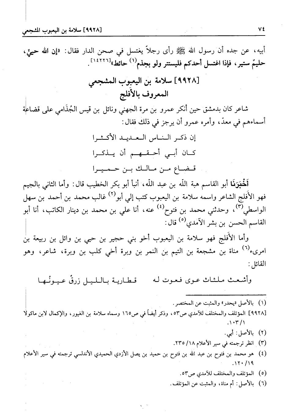أخبرنا أبو القاسم هبة الله بن عبد الله، أنبأ أبو بكر الخطيب قال: وأما الثاني بالجيم فهو الأفلج الشاعر واسمه سلامة بن اليعبوب كتب إلي أبو «2» غالب محمد بن أحمد بن سهل الواسطي «3» ، وحدثني محمد بن فتوح «4» عنه، أنا علي بن محمد بن دينار الكاتب، أنا أبو القاسم الحسن بن بشر الآمدي «5» قال: