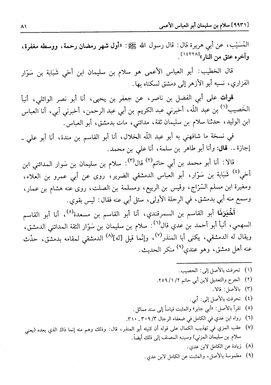 قرأت على أبي الفضل بن ناصر، عن جعفر بن يحيى، أنا أبو نصر الوائلي، أنبأ الخصيب «1» بن عبد الله، أخبرني عبد الكريم بن أبي عبد الرحمن، أخبرني أبي، أنا العباس ابن الوليد، حدثنا سلام بن سليمان ثقة، مدائني، مات بدمشق، أبو العباس.