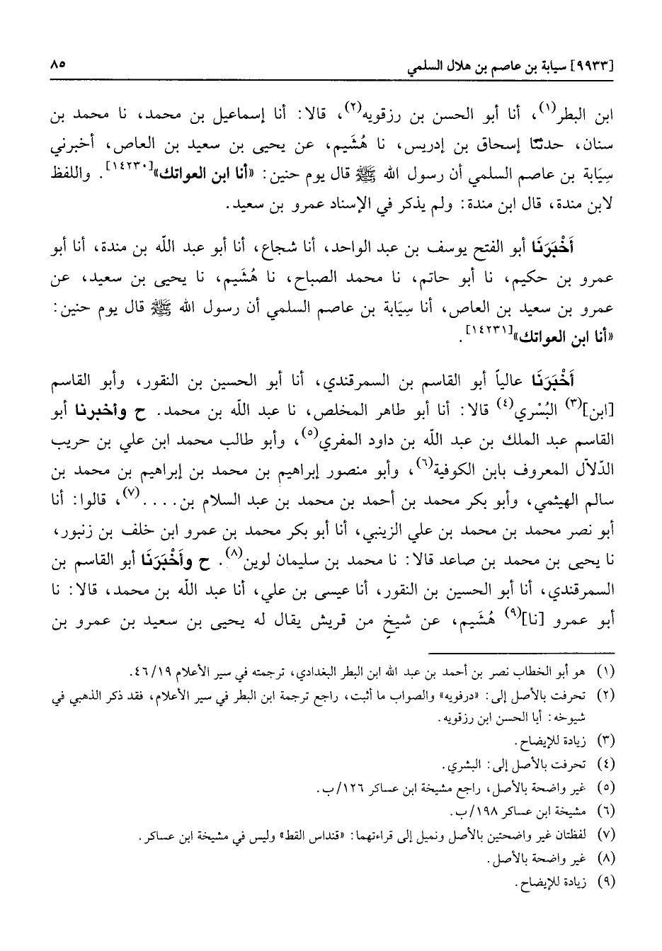 أخبرنا أبو الفتح يوسف بن عبد الواحد، أنا شجاع، أنا أبو عبد الله بن مندة، أنا أبو عمرو بن حكيم، نا أبو حاتم، نا محمد الصباح، نا هشيم، نا يحيى بن سعيد، عن عمرو بن سعيد بن العاص، أنا سيابة بن عاصم السلمي أن رسول الله صلّى الله عليه وسلّم قال يوم حنين: