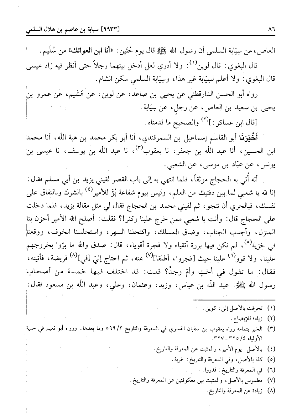 العاص، عن سيابة السلمي أن رسول الله صلّى الله عليه وسلّم قال يوم حنين: «أنا ابن العواتك» من سليم.