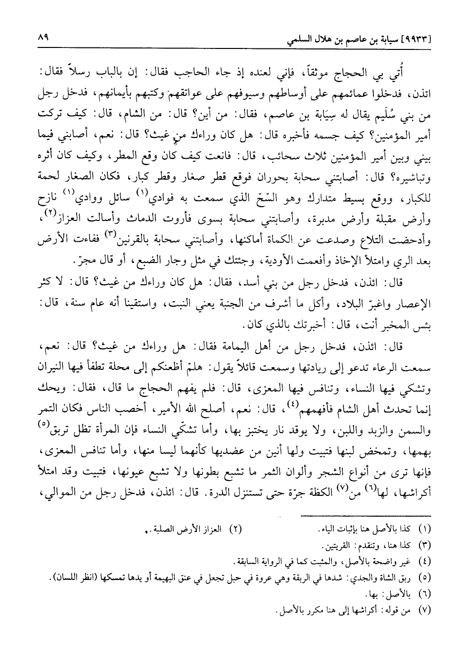 قال: ائذن، فدخل رجل من أهل اليمامة فقال: هل وراءك من غيث؟ قال: نعم، سمعت الرعاء تدعو إلى ريادتها وسمعت قائلا يقول: هلمّ أظعنكم إلى محلة تطفأ فيها النيران وتشكي فيها النساء، وتنافس فيها المعزى، قال: فلم يفهم الحجاج ما قال، فقال: ويحك إنما تحدث أهل الشام فأفهمهم «4» ، قال: نعم، أصلح الله الأمير، أخصب الناس فكان التمر والسمن والزبد واللبن، ولا يوقد نار يختبز بها، وأما تشكّي النساء فإن المرأة تظل تربق «5» بهمها، وتمخض لبنها فتبيت ولها أنين من عضديها كأنهما ليسا منها، وأما تنافس المعزى، فإنها ترى من أنواع الشجر وألوان الثمر ما تشبع بطونها ولا تشبع عيونها، فتبيت وقد امتلأ أكراشها، لها «6» من «7» الكظة جرّة حتى تستنزل الدرة. قال: ائذن، فدخل رجل من الموالي،