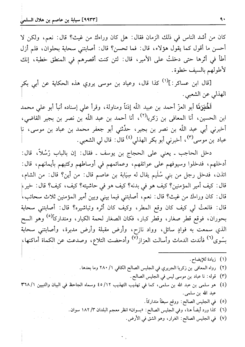 أدخلهم، فدخلوا وسيوفهم على عواتقهم، وعمائمهم في أوساطهم وكتبهم بأيمانهم، قال: ائذن، فدخل رجل من بني سليم يقال له سيابة بن عاصم قال: من أين؟ قال: من الشام، قال: كيف أمير المؤمنين؟ كيف هو في بدنه؟ كيف هو في حاشيته؟ كيف، كيف؟ قال: خير، قال: كان وراءك من غيث؟ قال: نعم، أصابتني فيما بيني وبين أمير المؤمنين ثلاث سحائب، قال: فانعت لي كيف كان وقع المطر، وكيف كان أثره وتباشيره؟ قال: أصابتني سحابة بحوران، فوقع قطر صغار، وقطر كبار، فكان الصغار لحمة الكبار، ومتداركا «5» وهو السح الذي سمعت به فواد سائل، وواد نازح، وأرض مقبلة وأرض مدبرة، وأصابتني سحابة بسوى «6» فأندت الدماث وأسالت العزاز «7» وأدحضت التلاع، وصدعت عن الكماة أماكنها،