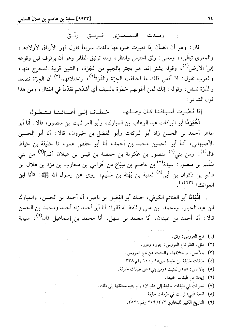 أخبرنا أبو البركات عبد الوهاب بن المبارك، وأبو العز ثابت بن منصور، قالا: أنا أبو طاهر أحمد بن الحسن زاد أبو البركات وأبو الفضل بن خيرون، قالا: أنا أبو الحسين الأصبهاني، أنبأ أبو الحسين محمد بن أحمد، أنا أبو حفص عمر، نا خليفة بن خياط قال «4» : ومن بني «5» منصور بن عكرمة بن حفصة بن قيس بن عيلان [ثم] «6» من بني سليم بن منصور: سيابة «7» بن عاصم بن سباع من خزاعي بن محارب بن مرّة بن هلال بن فالج بن ذكوان بن أبي «8» ثعلبة بن بهثة بن سليم، روى عن رسول الله صلّى الله عليه وسلّم: «أنا ابن العواتك»