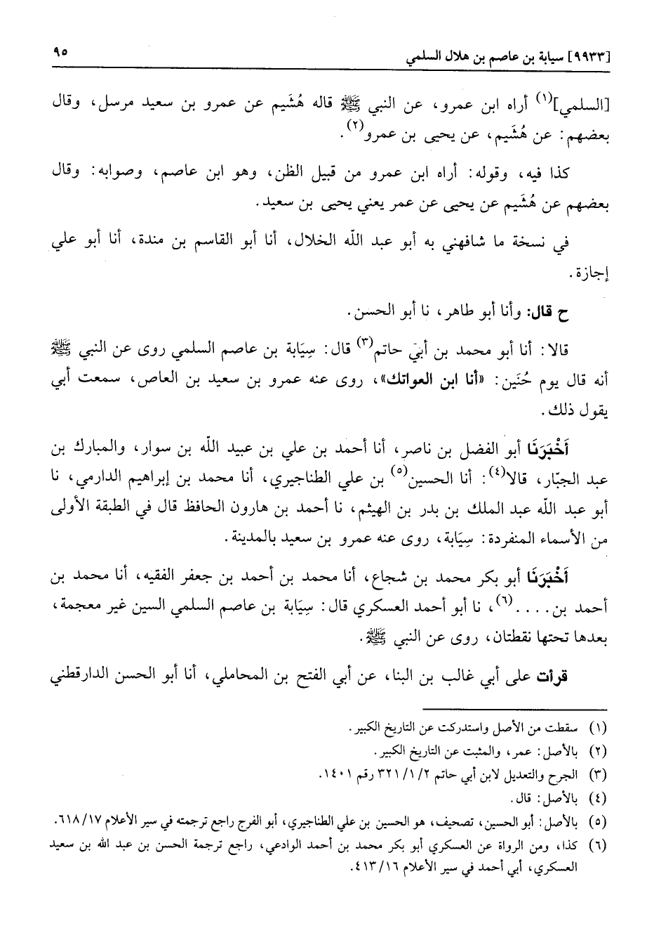 قالا: أنا أبو محمد بن أبي حاتم «3» قال: سيابة بن عاصم السلمي روى عن النبي صلّى الله عليه وسلّم أنه قال يوم حنين: «أنا ابن العواتك» ، روى عنه عمرو بن سعيد بن العاص، سمعت أبي يقول ذلك.