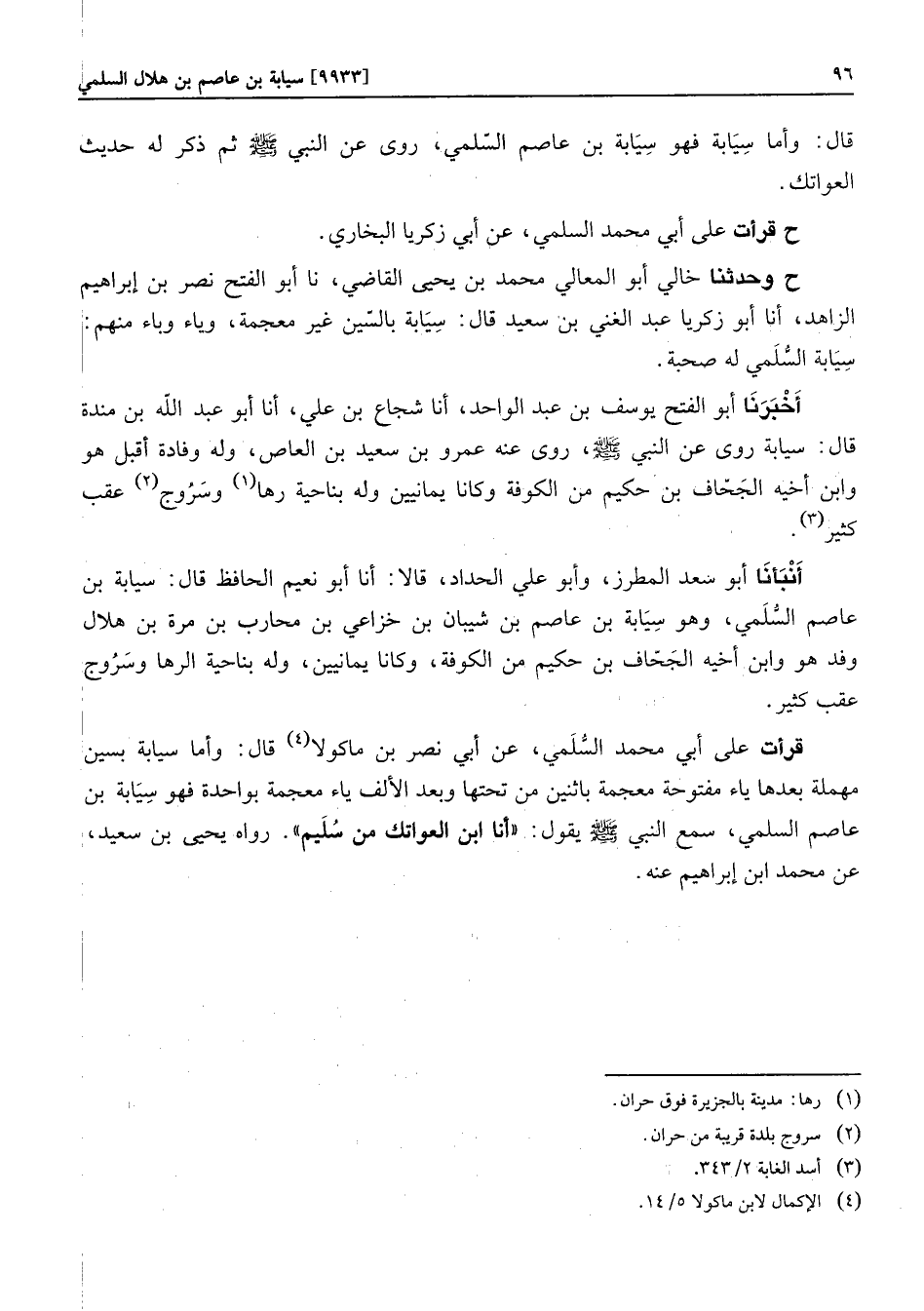 أنبأنا أبو سعد المطرز، وأبو علي الحداد، قالا: أنا أبو نعيم الحافظ قال: سيابة بن عاصم السّلمي، وهو سيابة بن عاصم بن شيبان بن خزاعي بن محارب بن مرة بن هلال وفد هو وابن أخيه الجحّاف بن حكيم من الكوفة، وكانا يمانيين، وله بناحية الرها وسروج عقب كثير. قرأت على أبي محمد السّلمي، عن أبي نصر بن ماكولا «4» قال: وأما سيابة بسين مهملة بعدها ياء مفتوحة معجمة باثنين من تحتها وبعد الألف ياء معجمة بواحدة فهو سيابة بن عاصم السلمي، سمع النبي صلّى الله عليه وسلّم يقول: «أنا ابن العواتك من سليم» . رواه يحيى بن سعيد، عن محمد ابن إبراهيم عنه.