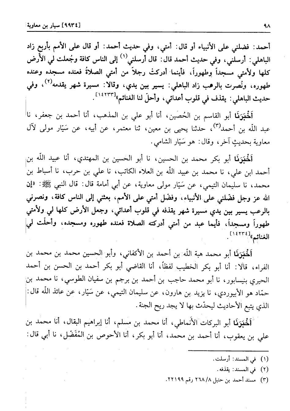 أخبرنا أبو بكر محمد بن الحسين، نا أبو الحسين بن المهتدي، أنا عبيد الله بن أحمد ابن علي، نا محمد بن عبيد الله بن العلاء الكاتب، نا علي بن حرب، نا أسباط بن محمد، نا سليمان التيمي، عن سيّار مولى معاوية، عن أبي أمامة قال: قال النبي صلّى الله عليه وسلّم: «إن الله عز وجل فضّلني على الأنبياء، وفضّل أمتي على الأمم، بعثني إلى الناس كافة، ونصرني بالرعب يسير بين يدي مسيرة شهر يقذفه في قلوب أعدائي، وجعل الأرض كلها لي ولأمتي طهورا ومسجدا، فأيما عبد من أمتي أدركته الصلاة فعنده طهوره ومسجده، وأحلّت لي الغنائم»